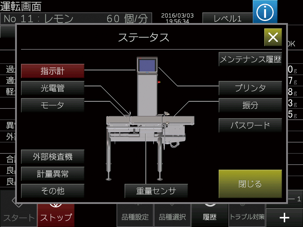 ・計量異常、光電管異常、その他異常を監視し、警告します。その際、エラー発生箇所はもちろん、復旧方法を画面で表示することで、復旧までに要するダウンタイムを短縮します。